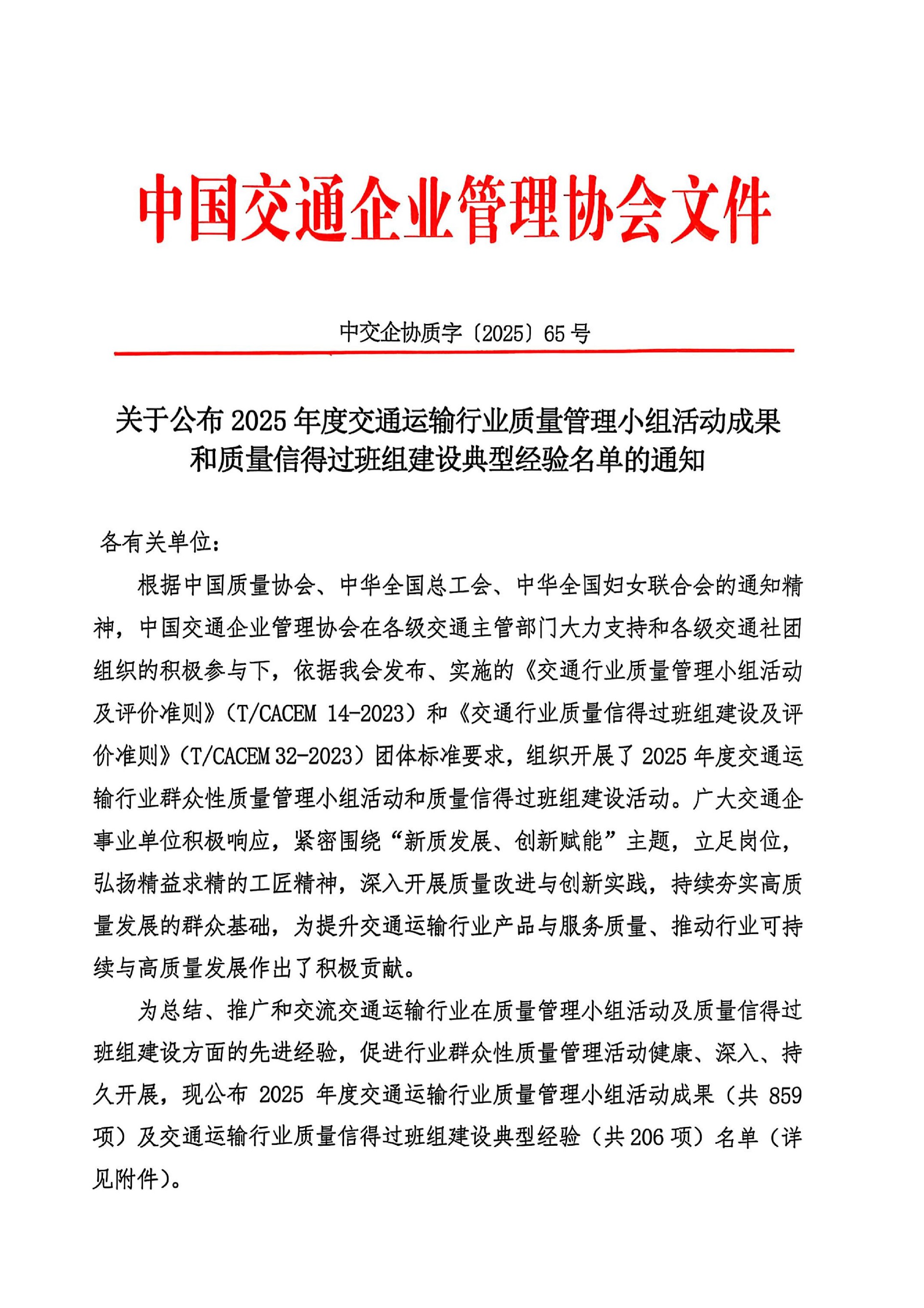 • 2025-11-21 公司質量管理成果榮獲全國交通運輸行業一等獎
